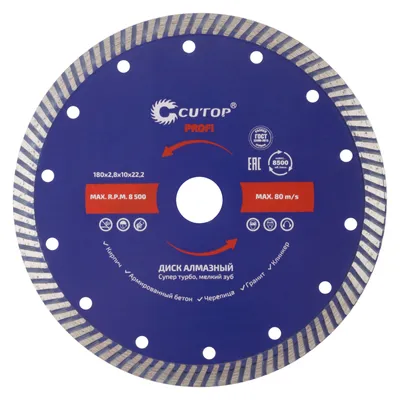 5912 ₸Диск отрезной алмазный Cutop Profi 180x2.8x10x22.2мм 65-18028Код: 33925Серия «Profi»Диаметр - 180 ммВысота слоя - 10 ммТолщина - 2.8 ммПосадочный диаметр - 22.2 мм - В наличии