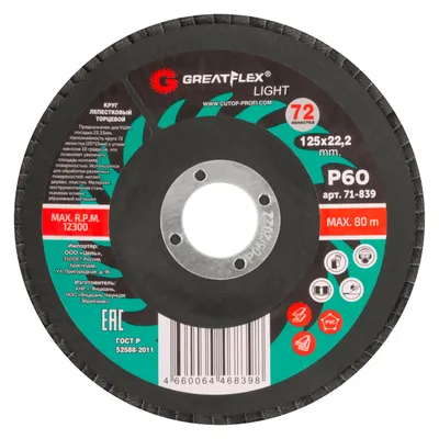 529 ₸Круг лепестковый торцевой GreatFlex Light 125х22.2мм P60 71-839Код: 54333В наличии