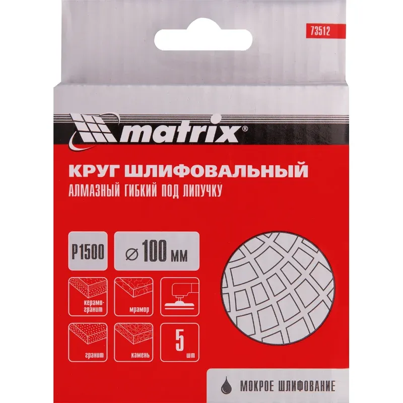 Шлифовальный круг MATRIX 100мм P1500 5шт. 73512 - предназначен для финишной обработки изделий из гранита, мрамора, керамогранита, натурального и искусственного камня. Работу следует проводить с применением охлаждающей жидкости. Круг изготовлен на гибкой основе, имеет алмазное напыление и крепится при помощи липучки.