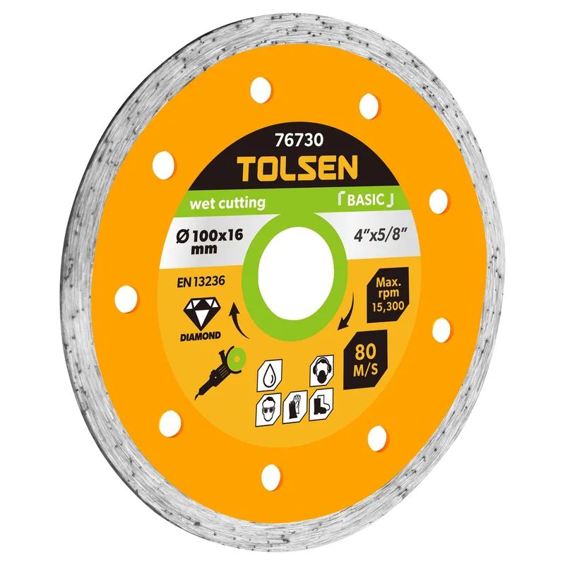 Диск алмазный отрезной сплошной мокрого реза Tolsen 230x22.2мм 76737 - предназначен для мокрого реза, обеспечивая чистый и точный рез. Идеален для работы с керамической плиткой, мрамором и другими твердыми материалами.