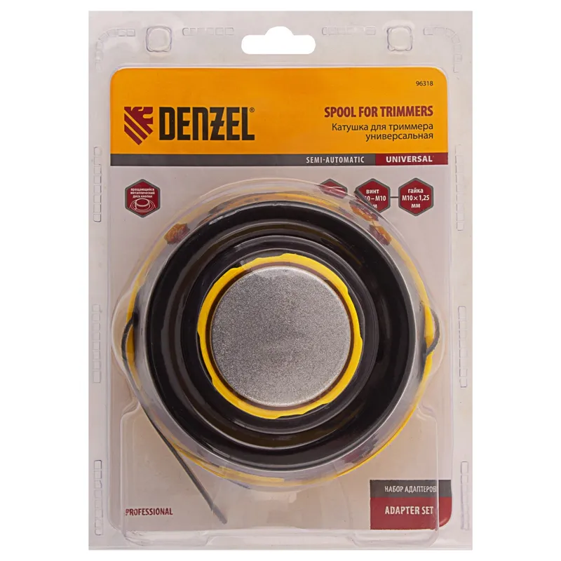 Катушка триммерная DENZEL 96318 - предназначена для использования с электрическими и бензиновыми косами. Адаптер «папа-папа» М8-М10 с левой резьбой делает возможным применение с моделями, оснащенными и присоединительным винтом, и гайкой. Максимально возможный диаметр лески составляет 3 мм, этого достаточно для скашивания высоких зарослей травы.