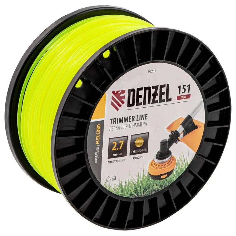 Леска для триммера DENZEL "FLEX CORD" 151м*2.7мм 96281 - круглого сечения, диаметром 2,7 мм и длиной 151 м, на DIN-катушке, предназначена для скашивания как мягкой, молодой травы, так и более густой растительности. Подходит для бензиновых триммеров с объемом двигателя 25-52 см3 и электрических триммеров мощностью от 1 до 1,5 кВт.