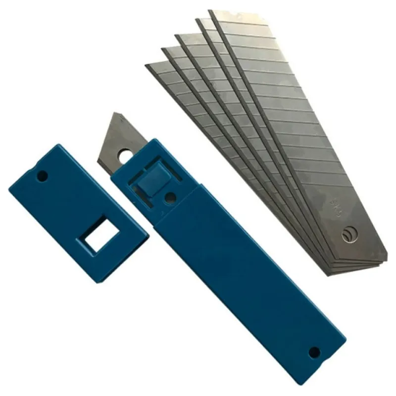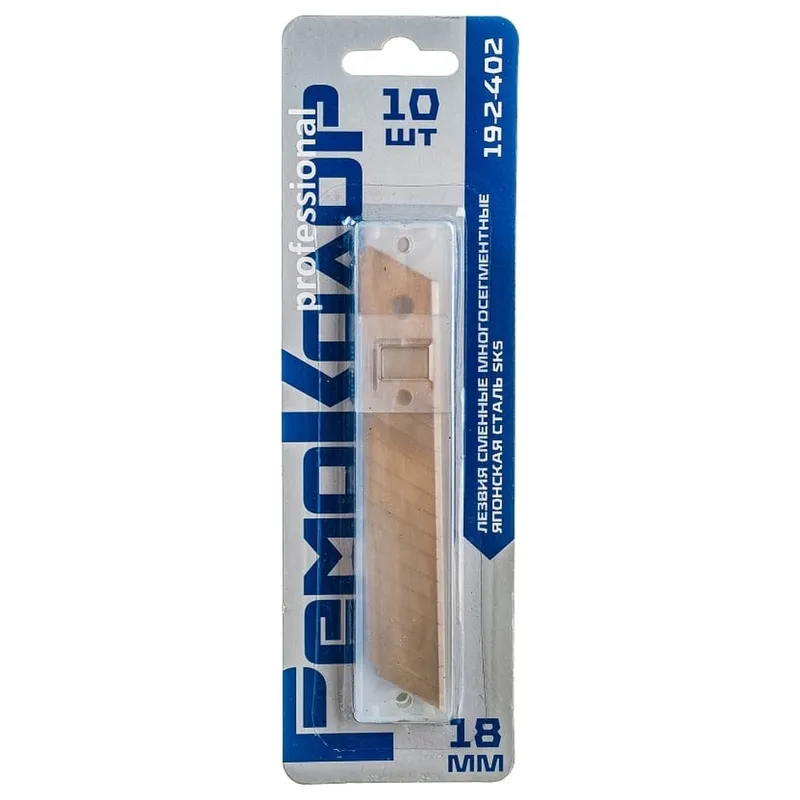 Лезвия сменные для резака RemoColor 18х100мм 10шт. 19-2-402 - предназначены для разрезания пленки, плотной бумаги, картона и других материалов. Являются сменным элементом основного выдвижного лезвия для резаков соответствующего размера. Насечки на лезвии позволяют оперативно заменить затупившийся сегмент. Материал: многосегментные (14 сегментов) лезвия 18 х 100 мм, толщина 0,5 мм из японской углеродистой стали SK5 с равномерно заточенной режущей кромкой. Набор из 10 шт. Упаковка пластиковый бокс.