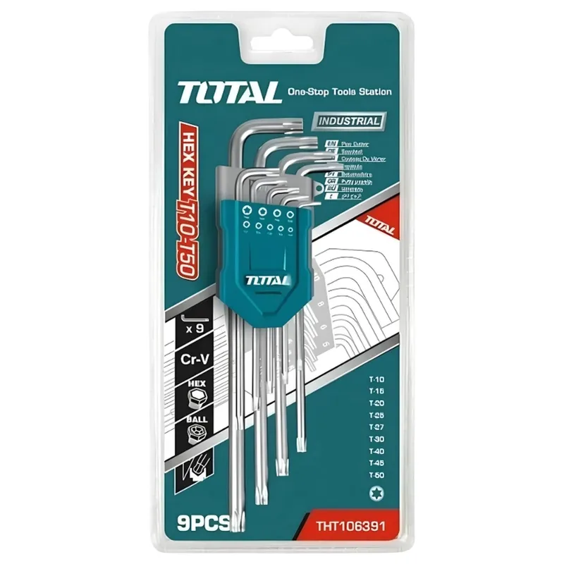 Набор имбусовых ключей TOTALTOOLS T10-T50 9шт. - это комплект инструментов с профилем TORX (звездообразный), предназначенный для работы с винтами и болтами соответствующего типа.