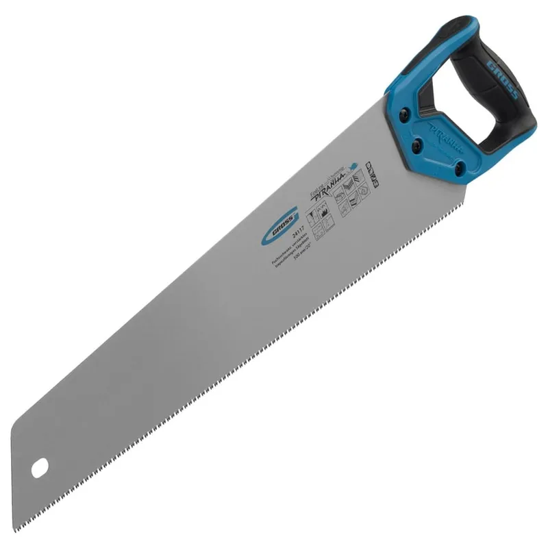Ножовка по дереву GROSS "PIRANHA" 500мм 24117 - используется для столярных работ. Ей пилят древесину различных пород, МДФ, ДСП, ДВП, ламинат, а также пенополистирол, полиуретан и другие синтетические материалы. Ножовка подходит для продольного и поперечного пиления. Выполняет точный и чистый рез благодаря мелким зубьям с шагом 11-12 TPI. Распиловка происходит с высокой скоростью без снижения качества, поскольку зубья имеют трехгранную заточку и осуществляют быстрый и ровный пропил без сколов. Инструмент рекомендован для профессионального применения, но может использоваться и в быту.