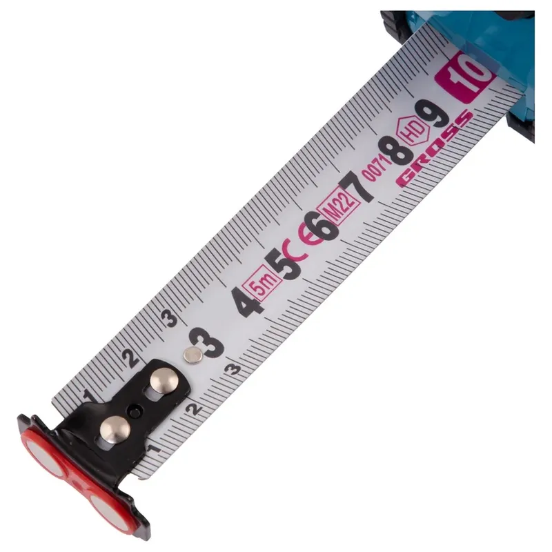 Рулетка GROSS 5м*25мм 32572 - в обрезиненном корпусе, с полотном 5 м х 25 мм, магнитным зацепом, нейлоновым покрытием и функцией автоматической фиксации, используется во время ремонтных и строительных работ. Оптимальна для измерения стен, полов, различных заготовок, мебели, оконных проемов и т.д. Благодаря магнитному зацепу рулетку удобно использовать для работы с металлическими поверхностями, а широкое упругое полотно облегчает проведение замеров в труднодоступных местах.