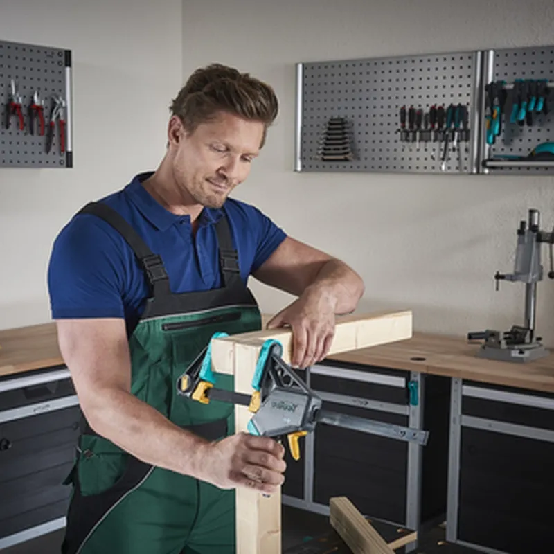 Струбцина быстрозажимная WOLFCRAFT "PRO L" 450мм 3032000 - идеально подходит для деревообработки и изготовления мебели, например, для фиксации и крепления заготовок. Инновационный механизм насоса позволяет осуществлять зажимание и открывание постепенно и контролируемо одной рукой. При этом возможно усилие зажимания до 120 кг. Эргономичная двухкомпонентая рукоятка с мягкой нескользящей зоной обеспечивает безопасную и удобную работу. Благодаря большим прорезиненным зажимным поверхностям с большой глубиной зажима в 100 мм распределение усилия зажимания происходит очень бережно по отношению к заготовке. Они имеют паз с V-образным профилем, что обеспечивает надежную фиксацию при зажимании круглого материала. Передвигаемые распорки защищают заготовку и служат опорными поверхностями для размещения зажатых заготовок. Для быстрого ослабления зажимного усилия просто нажмите рычаг. Благодаря практичной функции «2-в-1» одноручную струбцину можно без использования инструмента переоборудовать для работы в качестве распорок. Продукт отличается прочностью и долговечностью благодаря направляющей из специальной закаленной стали и стеклопластика (GFK). Дополнительно специальная перфорированная структура обеспечивает максимальную несущую способность и стабильность формы. Одноручная струбцина предлагается с различными шириной зажима и расширительными диапазонами.