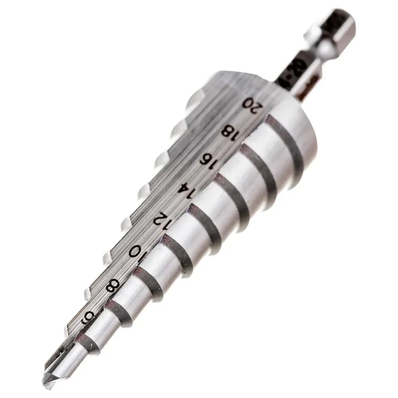 - Диапазон диаметров ступенчатых сверл: 4-20 мм