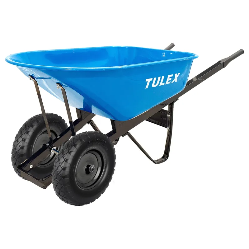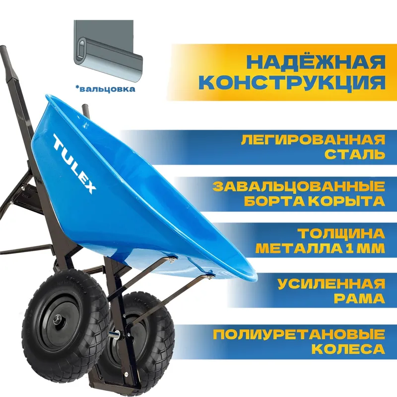 Тачка садово-строительная TULEX 250кг 170л 1132 - это двухколесная усиленная строительная тачка, предназначенная для транспортировки тяжелых и сыпучих материалов на строительных площадках и в сельском хозяйстве.