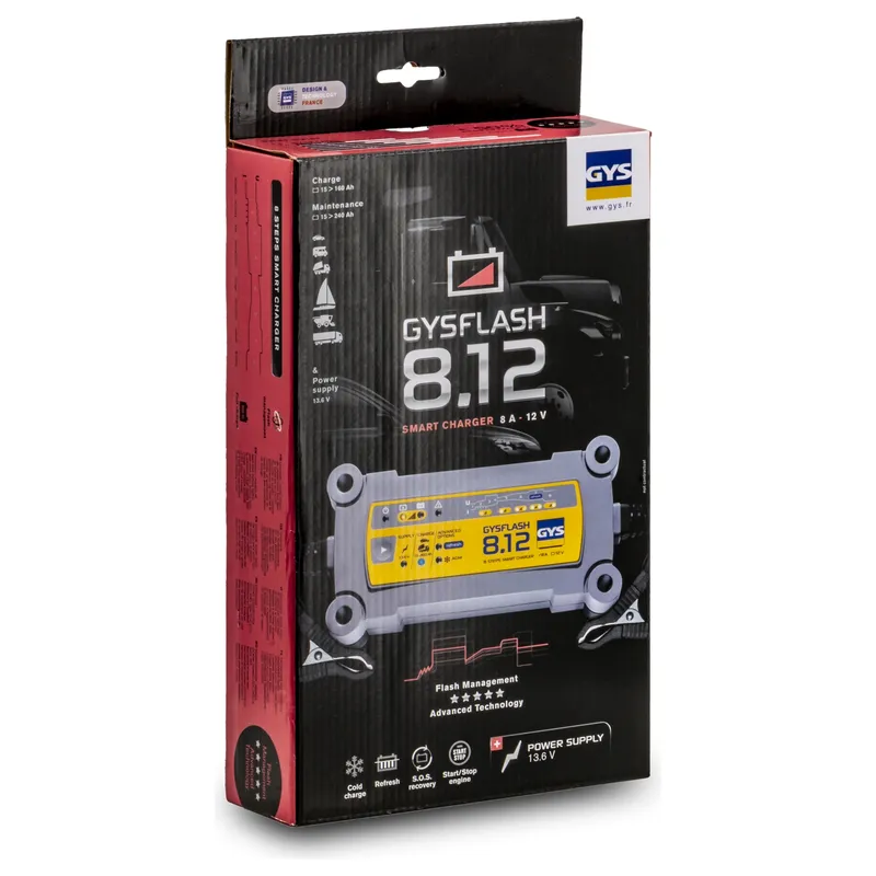 Зарядное устройство GYS "GYSFLASH" 8.12 029385 - специально разработан для зарядки аккумуляторов 12В всех типов машин, микроавтобусов, кемпинг-каров или грузовиков. Он имеет умную кривую зарядки в 8 этапов и режим «Supply» для подпитки машин в шоу-румах.